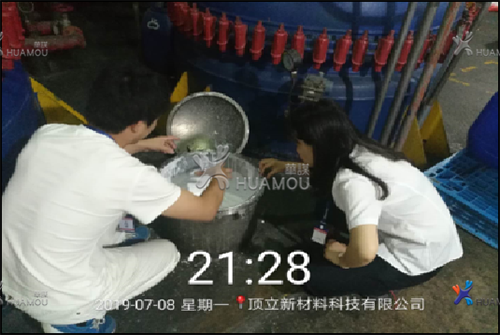 冰水池外壁冰水珠滴落地面造成熱熔膠1#區(qū)域地面經(jīng)常性潮濕,從冰水池到熱熔膠側(cè)門水流的痕跡未停(干)過,每天需用拖把拖4-5次,每次清理需15分鐘左右