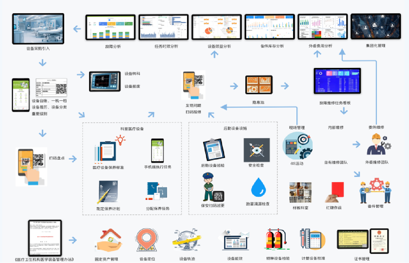 華醫(yī)修制原創(chuàng)的設備三圈防護維保體系解決方案,包含八大子系統(tǒng),通過咨詢+信息化的落地方式,全面提升醫(yī)院的精益管理水平